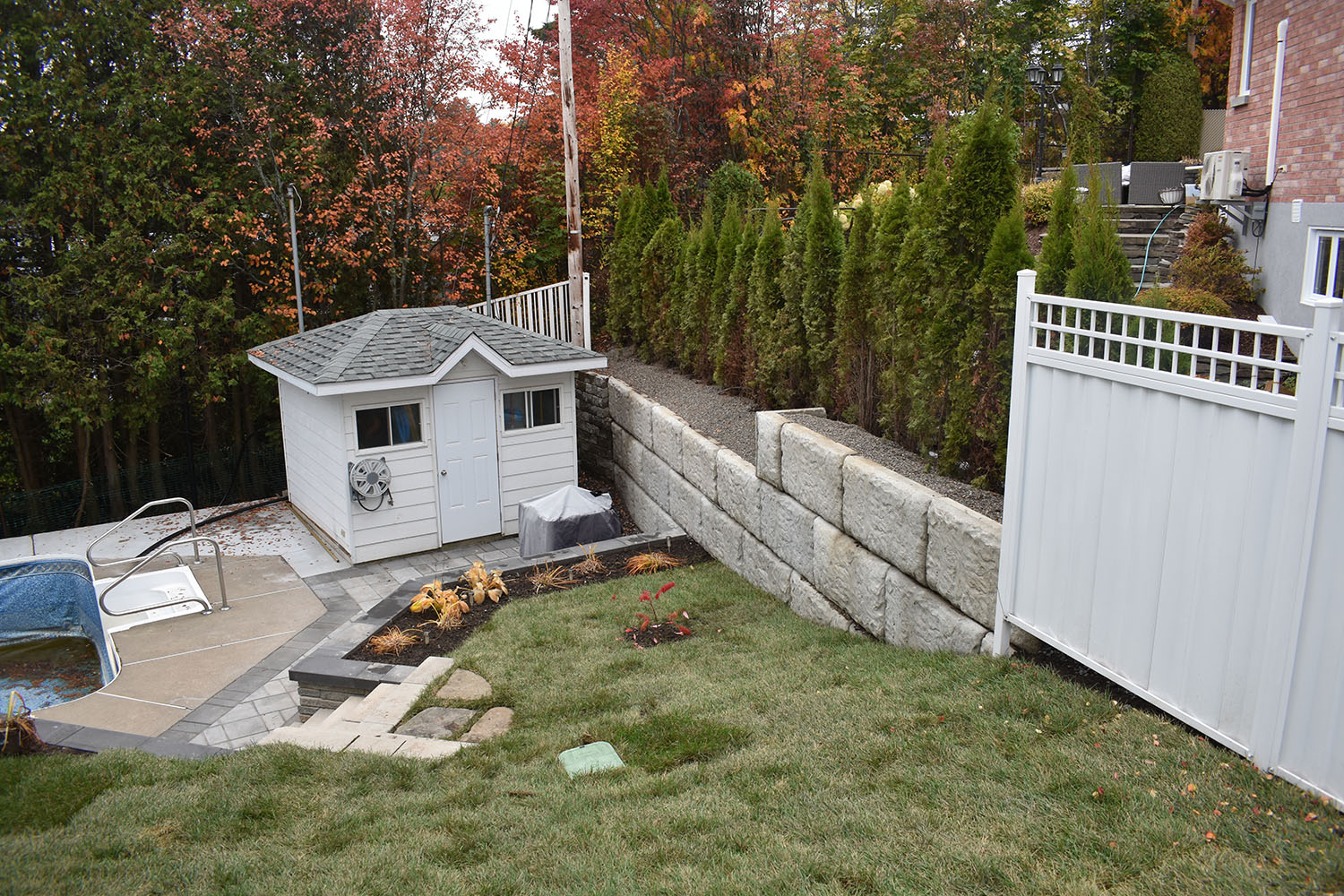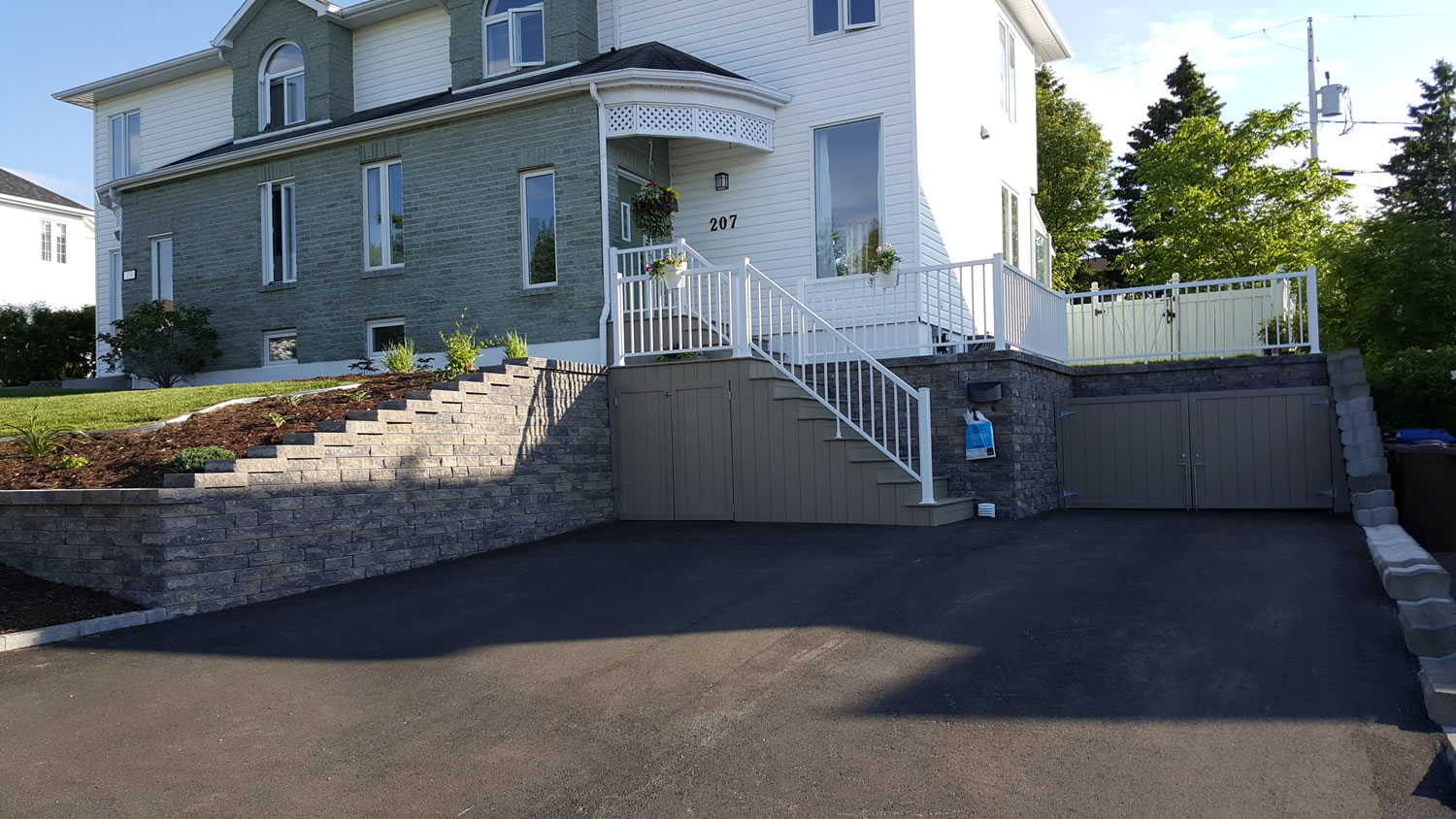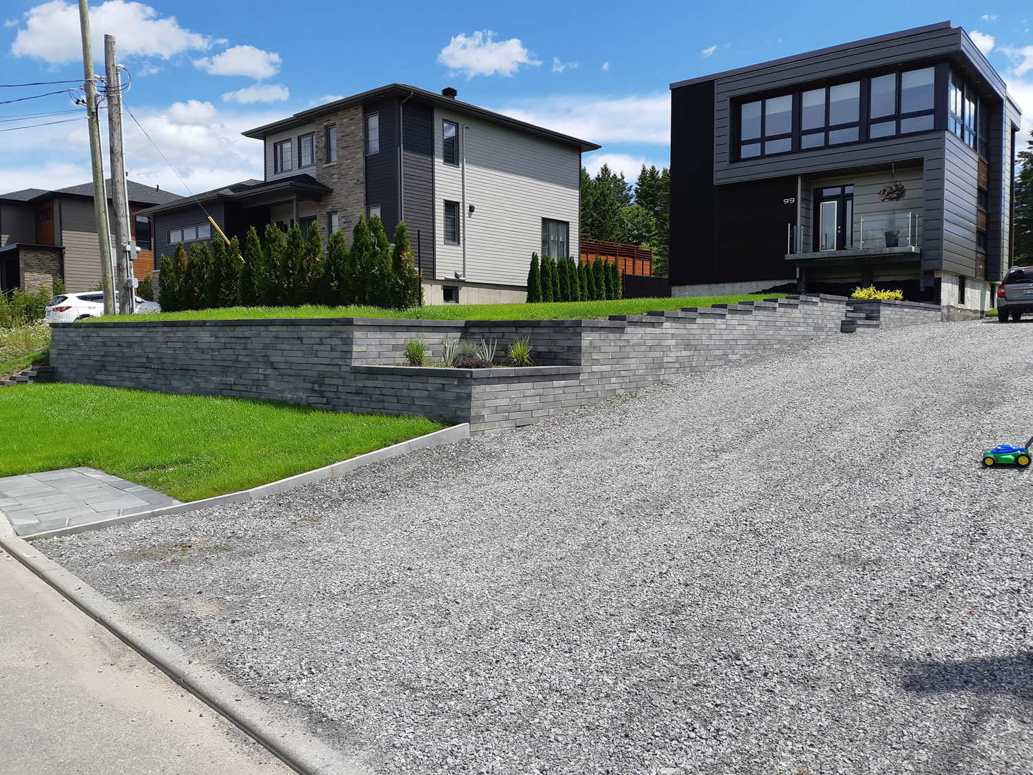 Les murs de soutènement servent à agrandir l’espace utile et permettent d’assurer la sécurité tout en donnant du panache à une propriété. Chez Paysagistes BSL, ils constituent l’une de nos spécialités. La pose des matériaux requiert une machinerie spécialisée ainsi qu’une expertise professionnelle. Donc, lorsque viendra le temps d’ériger ce type de mur, confiez-nous votre projet. Vous vous éviterez ainsi bien des déceptions futures.